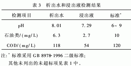 三口井固液分离析出水及固化物浸出液经当地环保部门检测,达到GB8978-1996《污水综合排放标准》二级标准。