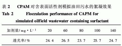 采用相同的模拟油田污水,研究有机絮凝剂阳离子聚丙烯酰胺(CPAM)对含表面活性剂模拟油田污水的絮凝效果,结果见表2。