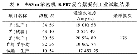 (2)53m浓密机底流浓度、溢流水质对比试验考察结果。试验考察结果见表5。