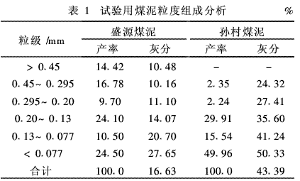 本次试验选用了张家口盛源煤矿选煤厂浮选前煤泥(简称盛源煤泥)及新汶矿业集团孙村煤矿选煤厂浮选尾矿煤泥(简称孙村煤泥),两种煤泥粒度组成分析见表1。从表1中可以看出,盛源煤泥灰分为16.63%,由于该煤泥没有经过浮选,煤泥中含有大量的精煤,而且煤泥粒度相对较粗,>0.2mm粒级产率为40.9%,灰分为10.5%;而孙村煤泥灰分较高,为43.39%,特别是<0.077mm粒级产率为49.96%,灰分为50.33%,这说明该煤泥中含有细泥质较多。