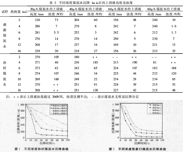 表2为加药1min后不同浓度煤泥水在不同药剂用量情况下的上清液高度及其浊度。图1、图2分别为不同浓度孙村煤泥水及盛源煤泥水沉降曲线,图3、图4分别为不同絮凝剂用量下盛源煤泥水和孙村煤泥水的沉降曲线。