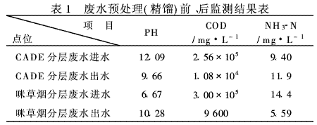由表1可以看出,咪草烟分层废水经精馏后化学需氧量可以削减96.8%,CADE分层废水经精馏后化学需氧量可以削减95.8%,大大降低了废水的污染物浓度,减少了废水的排放量,使废水进入到废水处理设施后更便于处理。