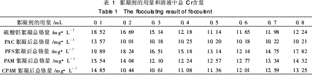 在处理污水的时候,复合絮凝剂的加入量是经还原后的污水量的3.5%(体积分数)。经处理后的清液中,总铬含量降至0.82mg.L-1,6价铬浓度为0.07mg.L-1,远低于国家总铬1.5mg.L-1和6价铬0.5mg.L-1的排放标准。