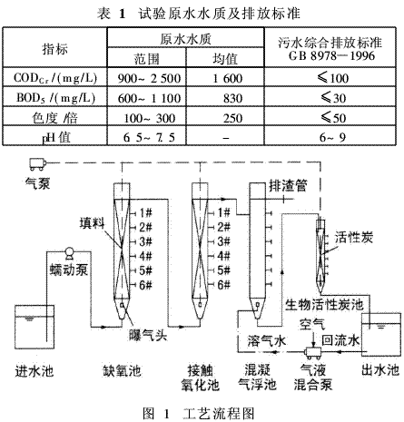 由表1可知,试验原水的BOD/COD比为0.50左右,总体可生化性尚好,因而采用生物与物化相结合的组合处理工艺,试验工艺流程见图1。