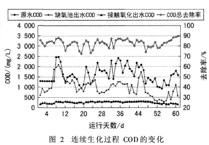 连续生化试验历时3个月,其中填料挂膜驯化期约30d,驯化稳定期可观察到粘附在填料上的生物膜结构密实、污泥絮体成球状。对生物接触氧化池内的填料进行显微镜观察,若发现有大量菌胶团存在,说明生物膜基本驯化成功,污泥沉降性能良好,可进行连续试验。试验结果见图2。