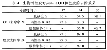经分析印染废水的组成发现,接触氧化处理后,固色剂和染料对废水COD的贡献较大,且是主要的难降解物质。因此对这些难降解物质单独配水,进行生物活性炭池处理试验。结果见表3和表4。