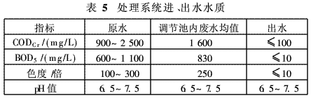 由表5知,该工程调试稳定后,运行情况良好,出水CODCr≤100mg/L,色度≤10倍,BOD5≤10mg/L,达到国家《污水综合排放标准》GB8978—1996的一级标准。