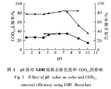 不同pH值条件下LDH对色度和CODCr的去除情况见图1所示。