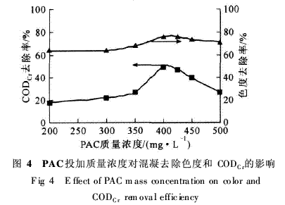 由图4可见,PAC的投加质量浓度存在一个较佳的范围,随着PAC投加质量浓度的增加,CODCr、色度的去除率随之增加。当PAC投加质量浓度为400mg/L时,CODCr、色度的去除率达到最佳效果,之后去除效果随PAC投加质量浓度增加,反而逐渐变差。这主要是随着PAC投加质量浓度的增加,产生的高价阳离子多核羟基络合物增强了吸附电中和作用,促进了胶体和悬浮物等快速脱稳、凝聚和沉淀。当PAC过量时,会产生复稳现象,CODCr、色度的去除率变差。