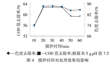 在最佳处理条件下对印染废水进行絮凝沉降处理,处理后废水的COD值为409mg/L(去除率42.23%),色度为21倍(去除率82.5%),取上清液,加入一定量粉煤灰进行吸附处理.