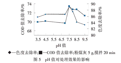 图5表明,在pH值为7.5时,COD值和色度去除率最大.综合考虑,pH值7.5为最佳.