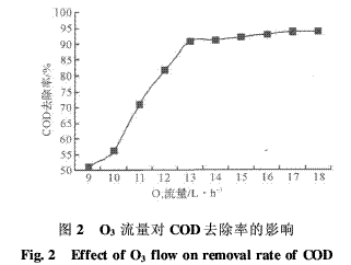 ÔÚ×ÏÍâ¹âÇ¿¶ÈΪ160W¡¢pHֵΪ5µÄÌõ¼þÏ£¬¿¼²ìO3Á÷Á¿¶ÔCODÈ¥³ýÂʵÄÓ°Ï죬½á¹û¼ûͼ2¡£
