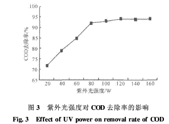ÓÉͼ3¿É¼û£¬Ôö´ó×ÏÍâ¹âÇ¿¶È¿ÉÌá¸ßCODÈ¥³ýÂÊ£¬µ±×ÏÍâ¹âÇ¿¶ÈΪ80Wʱ£¬CODÈ¥³ýÂÊ´ïµ½92%£»µ±×ÏÍâ¹âÇ¿¶È³¬¹ý80Wºó£¬CODÈ¥³ýÂÊÌá¸ß²»Ã÷ÏÔ¡£Õâ¿ÉÄÜÊÇÒòΪ£¬O3ÔÚ×ÏÍâ¹âÕÕÉäÏ¿ÉÌṩ¹âÁ¿×Ó£¬ÄܸüÓÐЧÓÕ·¢×ÔÓÉ»ùÐÍÁ´Ê½·´Ó¦£¬Ìá¸ßÇ¿Ñõ»¯ÐÔ.OHµÄ²úÂÊ£¬´Ó¶øÌá¸ßÁËCODµÄÈ¥³ýÂÊ¡£Òò´Ë£¬Ñ¡ÔñÊÊÒ˵Ä×ÏÍâ¹âÇ¿¶ÈΪ80W¡£