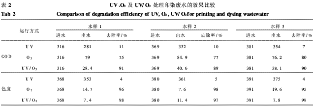 ÔÚO3Á÷Á¿Îª13L.h-1¡¢×ÏÍâ¹âÇ¿¶ÈΪ80W¡¢pHֵΪ5¡¢·øÉäʱ¼äΪ120minµÄÌõ¼þÏ£¬UV¡¢O3¼°UV/O3´¦ÀíӡȾ·ÏË®µÄCODÈ¥³ýÂʼ°É«¶ÈÈ¥³ýÂʱȽϼû±í2¡£