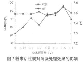 由于小试好氧池中按照1:10000的比例投加了粉末活性炭,而现场曝气池没有投加。因此考察粉末活性炭对混凝效果的影响。方法如下:先向8个1000mL的现场出水中加入0.0g、0.05g、0.1g、0.2g、0.3g、0.4g、0.5g、0.6g粉末活性炭,在100r/min的搅拌速度下快速搅拌30min,然后同上进行PAC+PAM混凝,静置20min后,过滤测定其COD、pH值。其结果见图2。