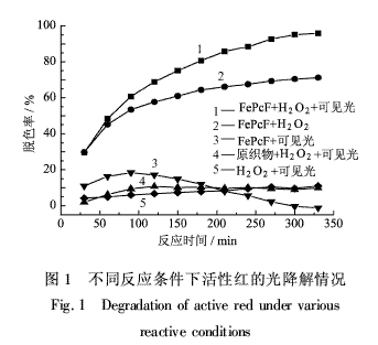 2.1 活性红溶液光催化氧化体系的反应条件为了考察催化纤维、氧化剂和可见光对反应体系的影响,设计5组不同条件的实验。40mg/L活性红溶液,pH值为4.93,纤维用量1.0g/L,H2O2浓度为0.19mol/L,模拟可见光照射下室温反应,结果见图1。曲线1显示出良好的脱色效果,反应300min,脱色率达到95%;曲线2表现出一定的脱色效果,但不能达到完全脱色;曲线3、4、5脱色反应几乎不发生。综上所述,H2O2的氧化作用、FePcF的催化作用和可见光的光敏作用是活性红降解的必要条件。以lnA对反应时间t作图,得动力学反应方程lnA=-0.0094t-0.07896,相关系数R2=0.9949,属于动力学一级反应。