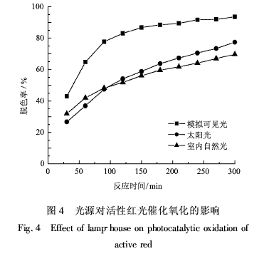 考察了3种光源对活性红光催化氧化的影响。分别为250W镝灯,太阳光直射和在室内自然光,从晴天上午9时开始光降解实验,其余均采用图1中曲线1的条件。结果表明,模拟可见光的催化效果明显高于太阳光直射和室内自然光的效果。由图4所示的太阳光和室内自然光对活性红光催化氧化的影响趋势可见,反应初期,室内自然光的脱色率略高于太阳光,而反应后期,直射太阳光的光催化效果略高于室内。模拟可见光的光源距离反应器较近,光照强度较大;直射太阳光从早晨到中午光照强度逐渐增大,但较模拟可见光小;而室内自然光的光照强度与直射太阳光相近,且一直较弱。这些都表明光照强度越大越有利于产生更多的.OH,加速活性红的降解。
