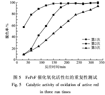 纤维用量为2.0g/L,其他条件同图1中曲线1的条件。第1次催化降解完成后将纤维取出,用蒸馏水清洗至洗涤液澄清,鼓风干燥箱内50℃烘干,再进行重复使用实验。由图5可知,纤维在重复2、3次使用时最初催化效果明显低于第1次,可能是由于第1次使用后纤维表面吸附了一些难以清洗除去的物质,阻止了催化剂对液相中活性红分子的作用,使催化反应速度减慢,但200min后第2次与第1次用效果几乎无差别,300min后第3次用也基本能达到前2次的处理效果。通过对反应后的溶液进行紫外可见全波长扫描,尚未发现FePcS的脱附。由此可见,该催化剂稳定,可以重复使用。
