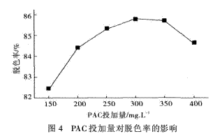 从图4可见,在最佳pH范围内,絮凝剂用量达到300mg/L时出现峰值,此后再增加絮凝剂的量,脱色率反而会降低。这与一般的絮凝现象相一致。因此PAC最佳投加量为300mg/L。