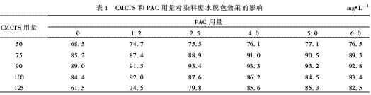 絮凝剂CMCTS及助凝剂PAC投加量对染料废水的脱色率影响结果见表1。