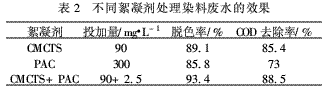 用CMCTS、PAC及CMCTS+PAC三种絮凝剂,分别在各自的最佳条件下,处理染料废水的效果见表2。