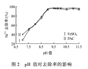 由图2可知:FeSO4和PAC对Ni2+的去除率受pH值的影响均比较大,在pH值为6.5~9.0之间时,Ni2+的去除率增加较快;当pH值分别为9.6和9.5时,Ni2+去除率达到各自的最大值96.87%和96.97%,溶液中Ni2+的质量浓度下降到1.0mg/L左右,达到《污水综合排放标准》中的一级排放标准;之后再随着pH值的升高,去除率开始缓慢下降。由此可知:当pH值在9.0~10.5之间时,FeSO4和PAC对Ni2+有较好的絮凝作用。
