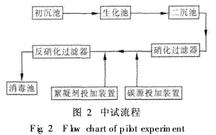 中试进水为污水处理厂二沉池出水,通过提升泵将原水提升至连续流砂反硝化过滤器,采用连续进、出水方式。在原水中投加少量絮凝剂,经管道混合器混合后进入连续流砂反硝化过滤器。