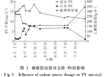 在6月19日下午至6月25日早8:00之间系统停止投加碳源,这段时间检测发现出水TN在10mg/L以上;从6月25日早8:00开始重新投加碳源,经过4.5h的运行后,取滤后水进行检测,发现出水总氮含量降到了10mg/L以下,这说明系统在停止运行几天、重新启动后只需4.5h便可恢复到正常运行状态。