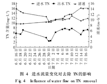 在污水处理厂的运行中流量会经常发生变化,为了验证连续流砂反硝化过滤器在不同滤速下对TN的去除效果,中试期间对系统的进水流量进行了调整,滤速从8.6m/h增加到14.3m/h,在不改变碳源投加量的情况下,出水TN浓度一直满足要求(见图4)。可见,连续流砂反硝化过滤器对进水流量具有较强的耐冲击能力,是一种具有较高性价比的污水深度处理脱氮工艺。
