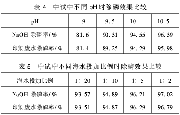 通过比较发现印染废水用量较小并且沉降性能好。所以选取印染废水进行试验并与NaOH进行对比,以确定其能否达到除磷效果的要求,结果见表2(反应温度=20℃,海水投加比例为1/5,反应时间20min)。