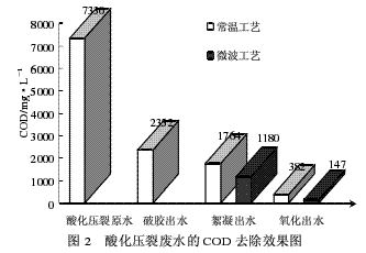 由表2可见,酸化压裂废水的BOD5/COD值为0.039,废水的可生化性很差;Ca(OH)2中和破胶后废水的可生化性得到提高,但可生化性仍然很低;絮凝后废水的可生化性进一步升高,微波絮凝提高的程度更大,使BOD5/COD达到了0.115;絮凝后出水经Fe/C床微电解吸附处理后废水的可生化性得到了显著提高,常规工艺和微波组合工艺处理后压裂废水的BOD5/COD值分别为0.17和0.327,微波组合工艺处理后的废水达到了微生物处理的要求。由于废水满足外排标准,同时又具有一定的可生化性,这样废水在进入环境水体后可进一步被水体中的微生物净化,减少了对环境的二次污染。