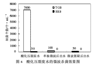 实验研究中对酸化压裂废水、微波絮凝后出水和单独微波照射后废水中的TGB和SRB数量进行了测定,以考察微波的杀菌效果,实验结果如图4所示。