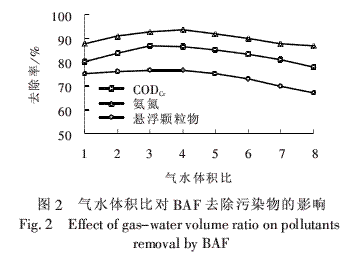 BAF为好氧处理工序,曝气不足,则局部呈现厌氧,微生物氧化CODCr和氨氮的能力较低,因而随着气水体积比增大,溶解氧浓度升高,CODCr和氨氮去除率均呈现升高趋势,当气水体积比接近3至4时,CODCr和氨氮去除率达到最大,分别为86.5%和93%;继续增大气水体积比会加剧陶粒间的滚动摩擦,使生物膜大量脱落而降低微生物浓度,使得CODCr和氨氮去除率降低。BAF去除悬浮颗粒物的能力主要来自于陶粒的截留作用和生物膜的吸附作用,气水体积比太大,则会加大陶粒间的缝隙和降低生物膜的厚度,均会降低悬浮颗粒物去除率,当比值为8,其去除率降低至66%。