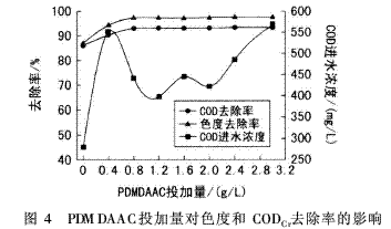 HRT为24h,考察PDMDAAC投加量对印染废水色度和COD去除率的影响,结果见图4。