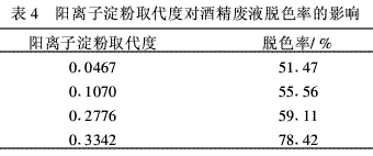 取本实验制备的不同取代度的阳离子淀粉进行絮凝实验。由表4可知,酒精废液的脱色率随阳离子淀粉取代度的提高而增加。经分析可知随阳离子淀粉取代度的提高,电荷密度增加,阳离子淀粉的电中和能力增强,相应地吸附在颗粒表面的阳离子淀粉的尾式和环式由于电荷密度高对另一颗粒负电荷区的吸引力增强,桥联絮凝能力增强,同理镶嵌作用也增强,因此阳离子取代度越高,絮凝效果越好。