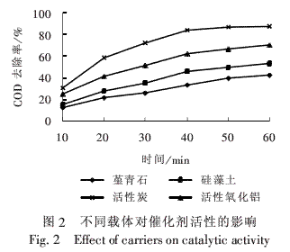 由图2可以看出,在任何一种载体上负载活性组分FexOy,对废水COD均有一定的去除效果,其中用活性炭作为催化剂载体时,催化臭氧分解能力最强,效果最佳。一般而言,催化剂的活性与其表面形态密切相关,表面孔结构越丰富、越大,则催化剂活性越高。在试验的几种材料中,活性炭的催化氧化性能比其它的载体好。因为活性炭是一种多孔性物质,内部具有发达的孔隙结构和巨大的比表面积,在采用浸渍法制备催化剂时,内部的微孔表面负载了一定量的FexOy,使其具有很好的催化效果。因此选择活性炭作为催化剂载体。