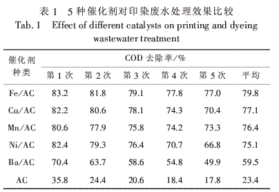 过渡元素具有易转移的电子(d或f电子),因此很容易发生电子的传递过程,这类元素的单质(金属)以及离子都具有较好的氧化还原的催化性能。目前应用于催化氧化过程的催化剂主要包括过渡金属及其氧化物、复合氧化物和盐类,分别取5种自制的催化剂各20g进行5次臭氧催化氧化试验,以COD的去除率作为催化剂活性的评价指标,试验结果如表1所示。