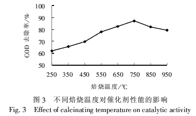 焙烧是活化催化剂的重要步骤之一,经焙烧除掉易挥发的组分,保留一定的化学组成,使催化剂具有稳定的催化性能。焙烧过程一般为吸热反应,当焙烧温度低,硝酸盐分解为细小的氧化物晶粒不完全,提高温度有利于焙烧时分解反应的进行;但温度过高会造成晶粒的烧结,催化剂比表面积减少,催化剂活性降低,故需控制好焙烧温度。Fe催化剂的不同焙烧温度对COD去除率的影响见图3。