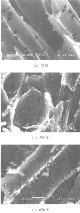由图4可以看出,在不同烧结温度下,活性炭表面和骨架中有新的晶相生成。与空白活性炭相比,负载了金属氧化物后活性炭表面的微观结构得到了明显改善,形成较多数量的催化剂表面孔穴,表面颗粒增多,存在更多的突起和凹穴,因此活性炭负载金属氧化物确实有利于提高载体本身的比表面积。由图3试验结果可知,在550~850℃内,负载型催化剂具有较好的催化活性,且750℃烧结温度的催化活性最好。从SEM中可以看出,随着烧结温度的增加,催化剂表面粗糙度增加,孔穴的数量、晶粒也随之增多。750℃烧结温度获得的催化剂表面晶粒更规整,空穴数量更多,当烧结温度为850℃时,从SEM图中明显可以看出在活性炭表面有部分的烧结坍塌现象存在,从而使催化剂的催化活性明显降低。由此表明,金属氧化物负载型催化剂存在一个最佳的烧结温度。