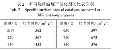 比表面积是催化性能的一个重要指标,催化剂比表面积越大,其催化效果往往较好。不同烧结温度下催化剂的比表面积如表2所示。