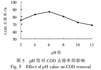 反应体系的pH值会直接影响催化剂中活性组分的流失量及催化剂的使用寿命,同时对催化剂反应活性的影响也较大。试验中,pH值分别取2、4、6、8、10、12进行臭氧催化氧化处理。考察了pH值对废水COD去除率的影响,试验结果见图5。