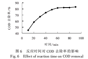 2.5反应时间的影响图6为反应时间对COD去除率的影响。随着催化氧化反应的进行,COD去除率在不断地提高,60min后COD去除率基本不再提高,这是催化反应生成了某些中间产物,它们是COD的组成部分,且不易被臭氧氧化。同时,臭氧自身的直接氧化反应是有选择性的,生成的某些中间产物正是臭氧难以直接氧化的。基于以上原因,印染废水COD去除率不再升高。同时考虑到增加氧化时间将增加动力消耗及废水停留时间,所以最佳反应时间选择为60min为宜,此时COD去除率达到86%。