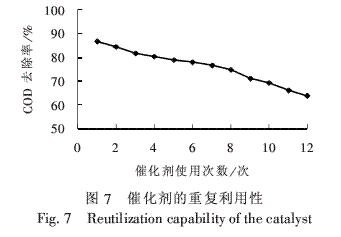 催化剂重复利用的稳定性是关系到该技术能否工业化的一个重要指标。为了考察催化剂的流失和重复使用效果,称取载铁活性炭20g,在上述最佳反应条件下,对实际印染废水进行重复试验。每次试验后将催化剂取出,干燥、称量,然后再重复上述试验。试验结果见图7:起初2次,COD去除率较大,是因为除臭氧催化氧化之外,新制的活性炭具有较大的吸附性能,对去除废水COD起到了一定作用;使用2次后,活性炭吸附渐渐达到饱和,COD去除率逐渐变小,重复使用12次以上,去除率约为64%,具有较好的稳定性。活性炭在使用中的破损、活性组分的溶出以及部分中间产物在催化剂表面的累积是可能降低催化剂活性的主要原因。