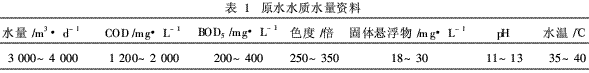 从上述工艺流程可以看出,水解酸化池并不是严格的厌氧工艺,它与传统理论上的水解酸化池有很大的不同.首先,填料上生长的厌氧菌起到厌氧作用,使大分子及难于生物降解的物质转化为易于生物降解的小分子物质,提高了废水的可生化性;其次,加入微量曝气搅拌以及污泥全部回流,就会产生或者带入好氧微生物,使池子又具有好氧生物处理作用,这样无形中增加了整个系统好氧生物处理段的体积与时间.所以此水解酸化池同时兼有厌氧、好氧处理能力.针对这种情况,研究整个系统,特别是水解酸化池的水质指标和微生物种类有重要的意义.公司印染废水原水情况如表1所示.