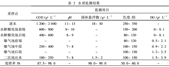 (1)在装有填料的水解酸化池中加入微量曝气、二沉池污泥全部回流水解酸化池,该反应池同时兼有厌氧、好氧处理能力,使得处理效率提高,经过水解酸化池处理后,COD可去除50%~70%,pH也从11~13下降到8左右;整个系统的COD、SS的处理率达到87.5%~98%,98%~99%;pH由进水的11~13下降到7~8;但由于A单元不是严格的厌氧池,并且有些有机物结构在好氧池中又重新结合在一起,使得整个系统的色度处理率仅有50%~60%.
