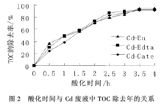 图1为采用不同方法对Cd-En废液处理后得到的TOC除去率曲线。