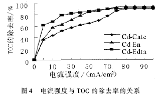 由图4可以看出,增加电流密度,TOC除去率也随之增大。但在电流密度为80mA/cm2时,TOC的除去率可达到96%,这之后继续增大电流密度,TOC除去率保持不变。说明80mA/cm2已是最佳电流密度。