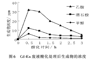从图6可以看出,乙二胺废液生成了少量的乙酸和酒石酸,甲醛。各种生成物浓度在酸化反应进行至0.5~1h时达到最高点,然后随着酸化时间的延长浓度逐渐降低。当酸化时间达到2.5h后,生成物的浓度低于污水综合排放标准(GB8978-1996),可以排放。