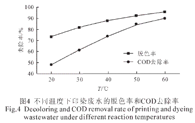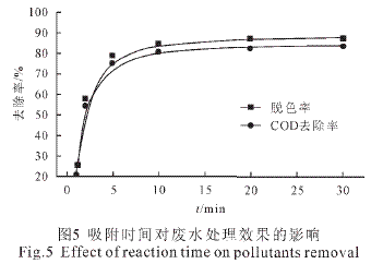 从图4中可以看出温度越高,脱色率越高,COD的去除率也越高。说明该吸附反应为吸热反应,高温有利于吸附的进行。