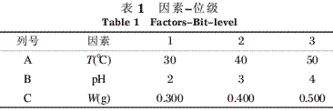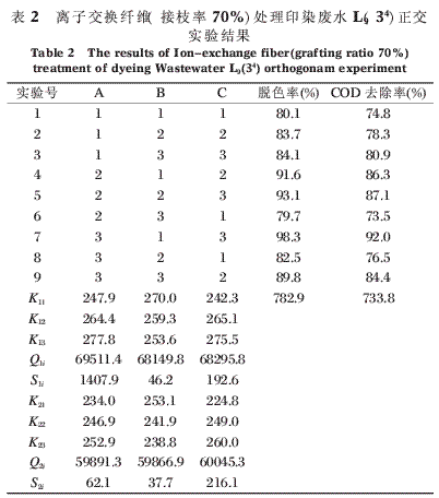 从以上实验结果得出,离子交换纤维处理印染废水的影响因素有:离子交换纤维用量、pH值、反应温度,反应时间等。为研究这些影响因素的综合效果,用接枝率为70%的离子交换吸附纤维对工厂印染废水(V=150mL)在反应时间t=1.5h条件下,用L(934)正交法进行静态吸附实验,实验安排见表1。实验结果见表2。
